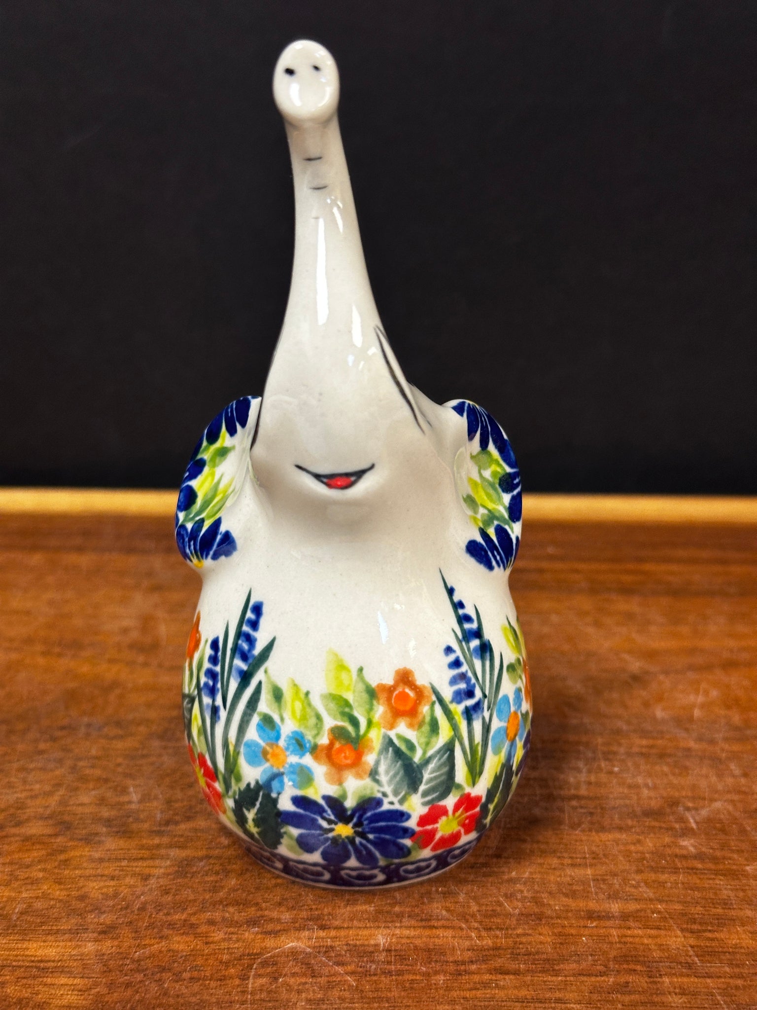 Adorable elephant holds rings on its trunk.  Cute as a figurine too.