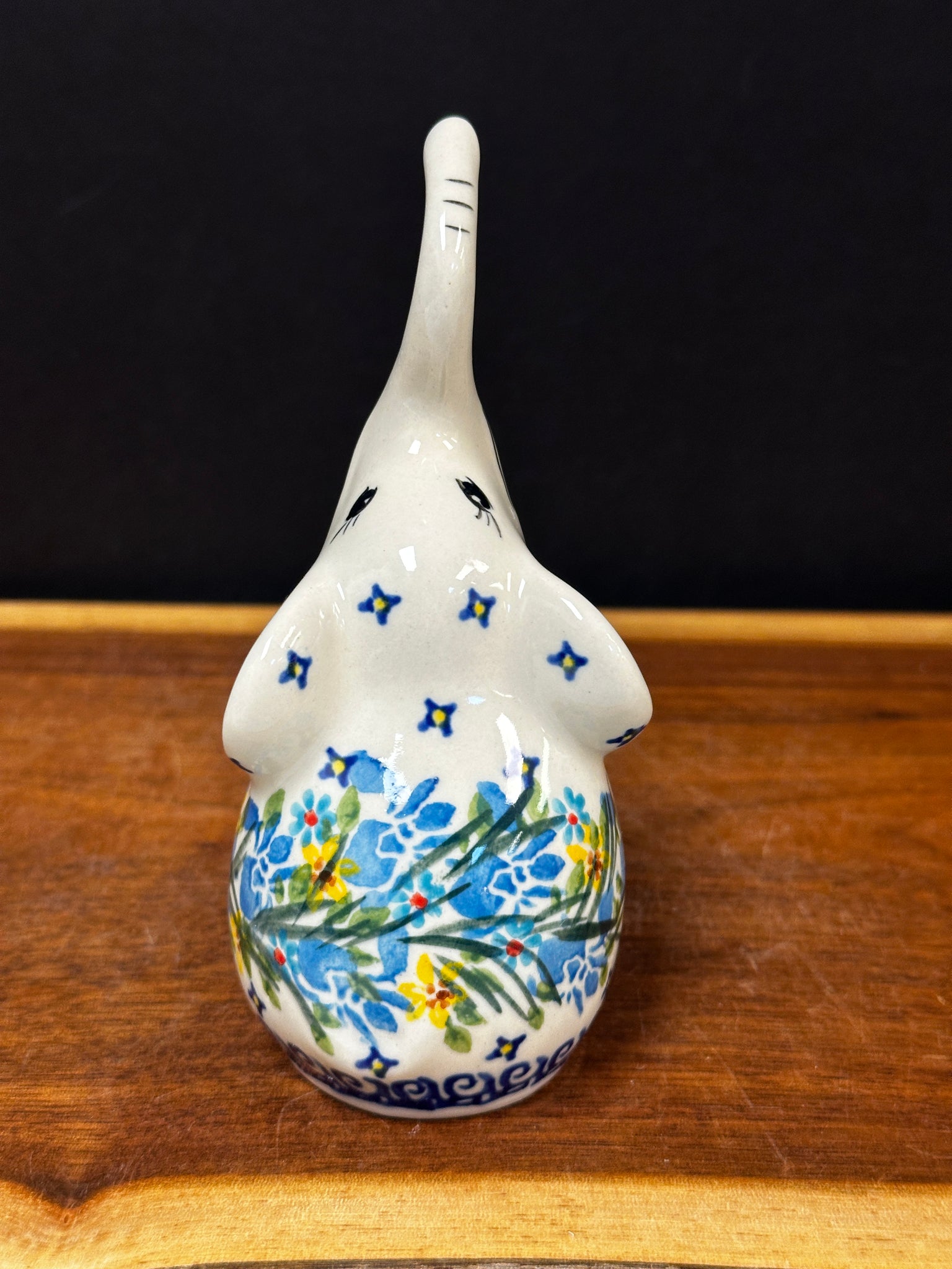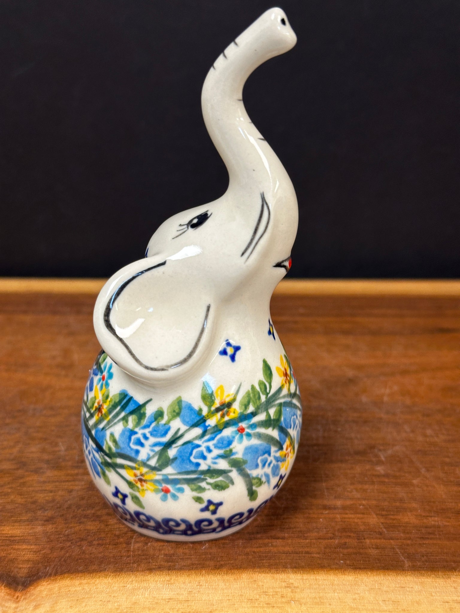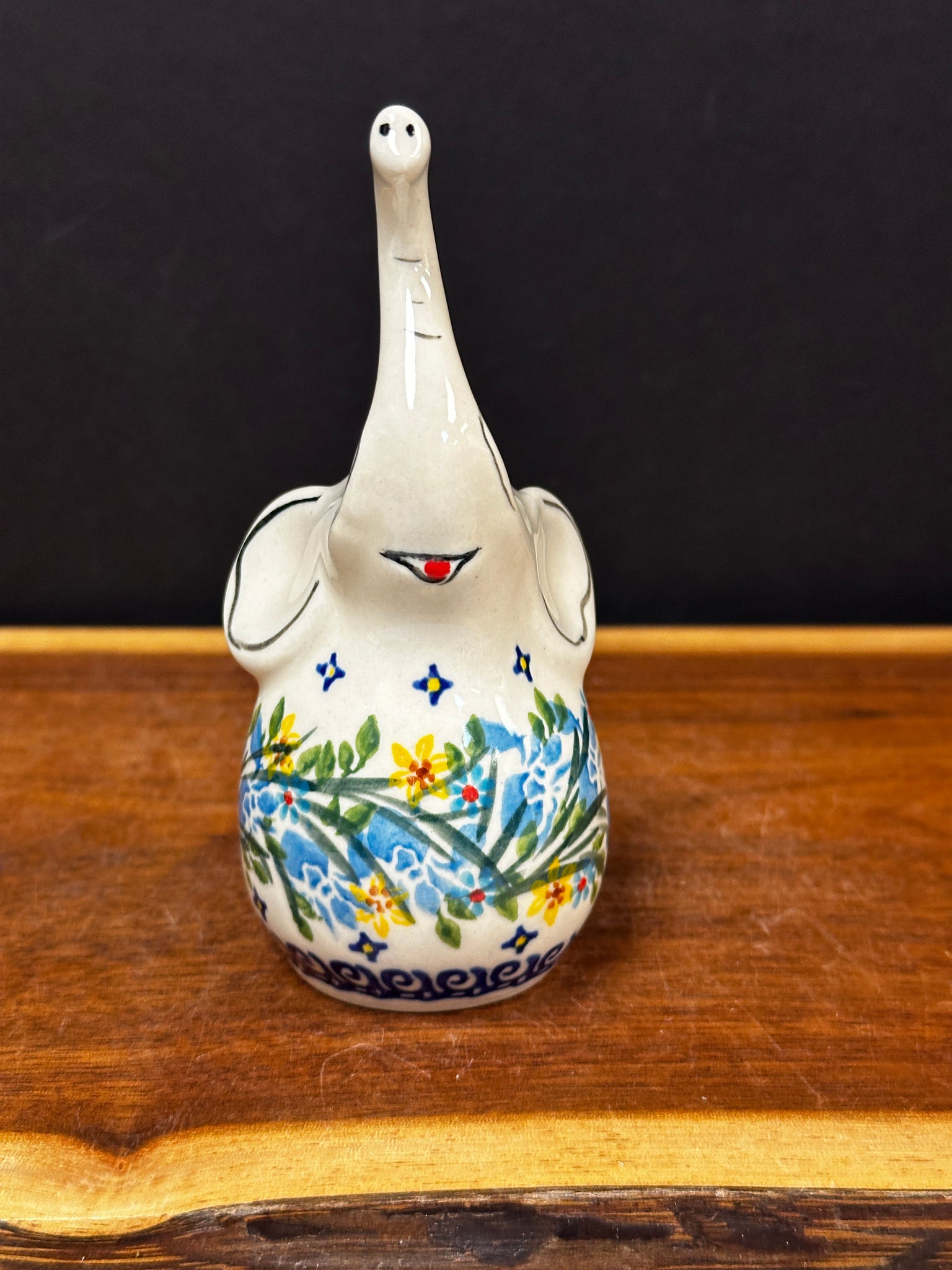 Adorable elephant holds rings on its trunk.  Cute as a figurine too.