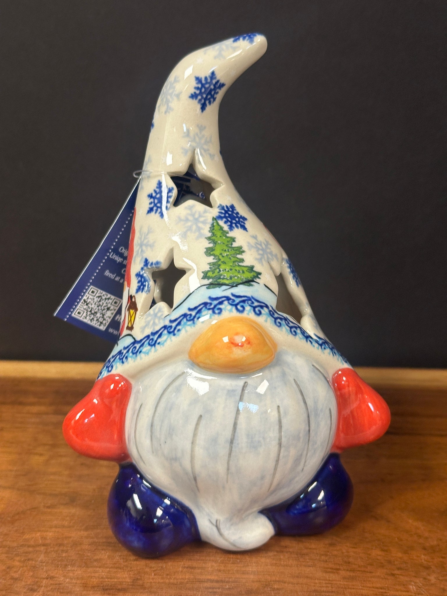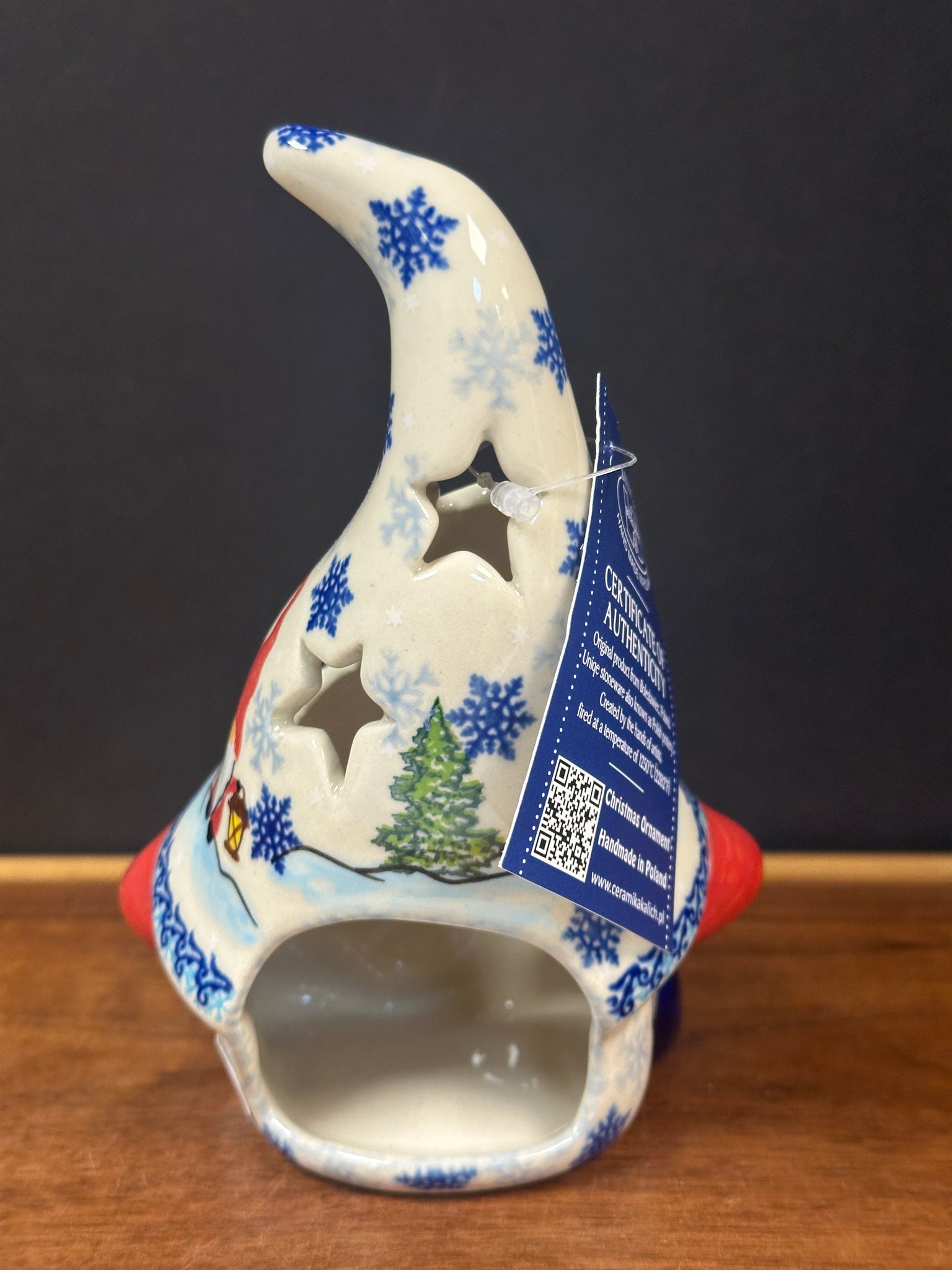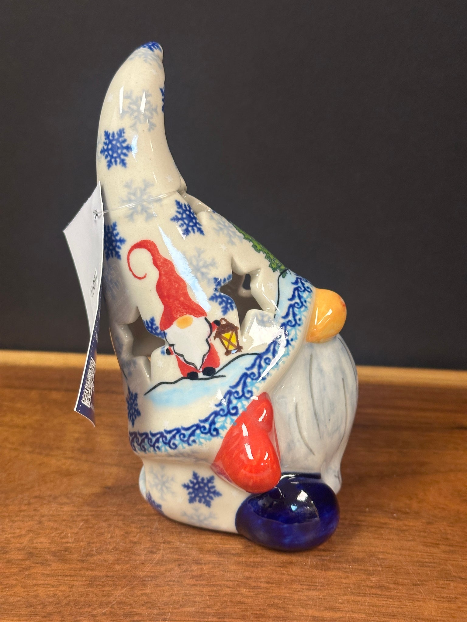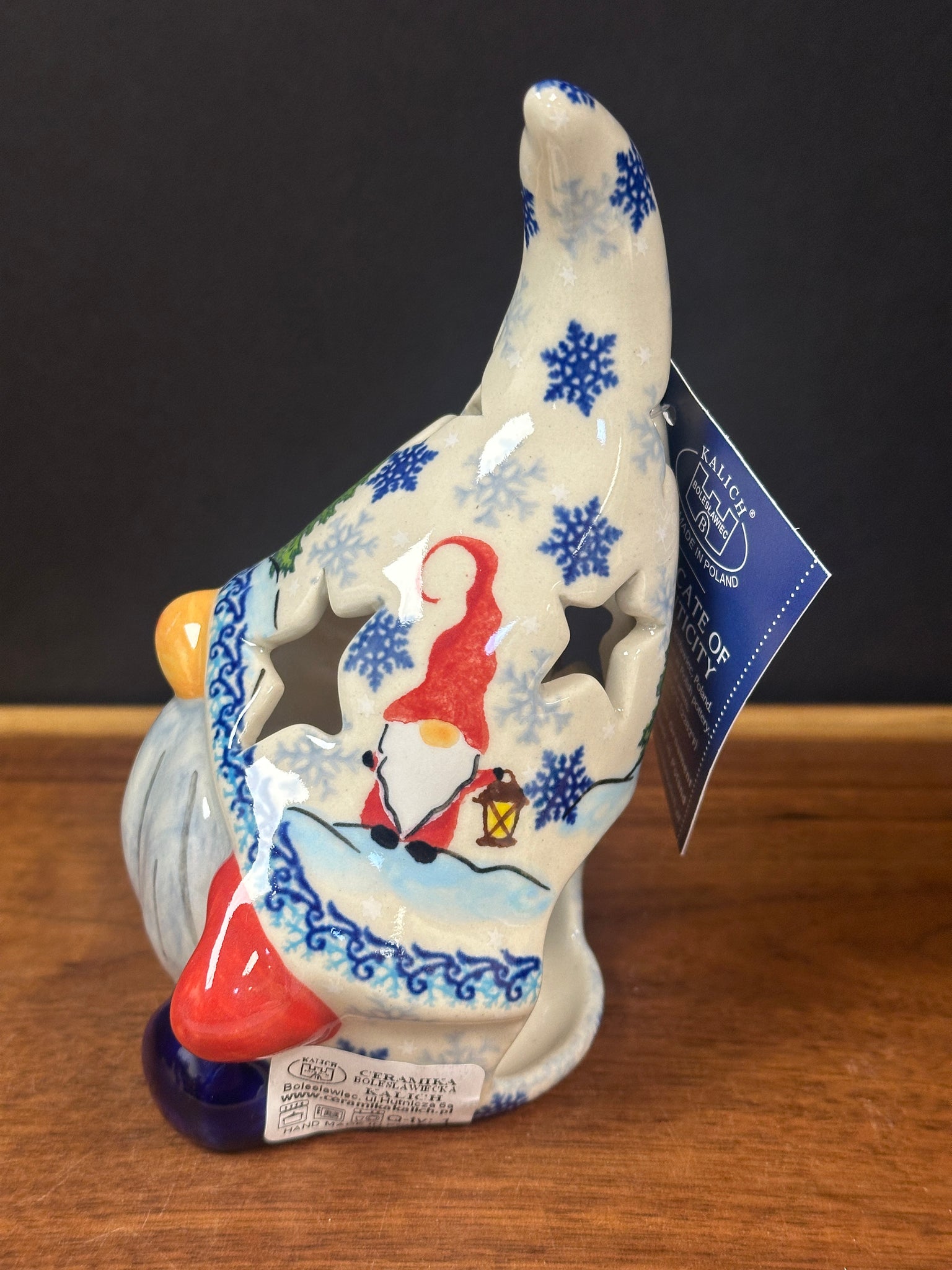 Kalich Gnome Luminary, approximately 6.5" tall. Open in the back to add a tealight candle or led string lights.