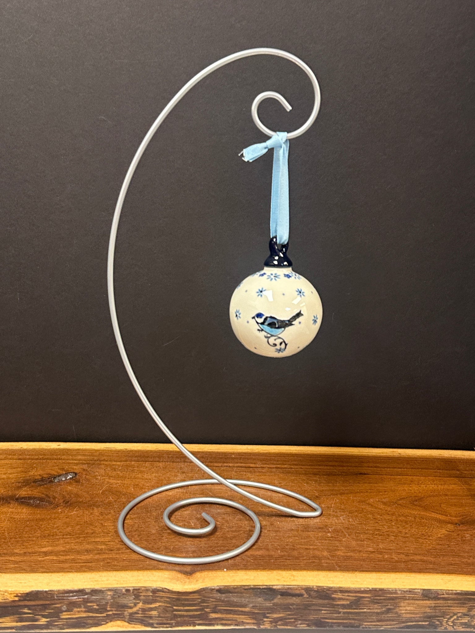 Ornament in photo measures 3.5" diameter hanging on a ribbon approximately 3" long. ORNAMENT NOT INCLUDED