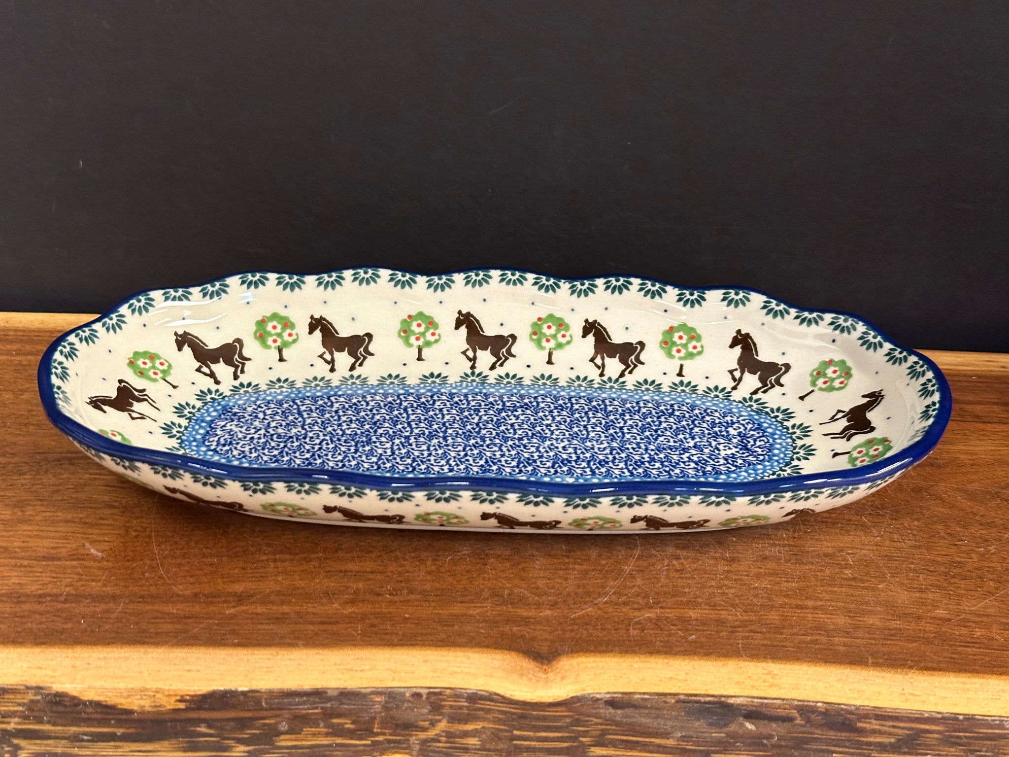 Beautiful Oval Platter with a scalloped edge for a fancy flair. Measures approximately 12.5" long and 6.25" wide.