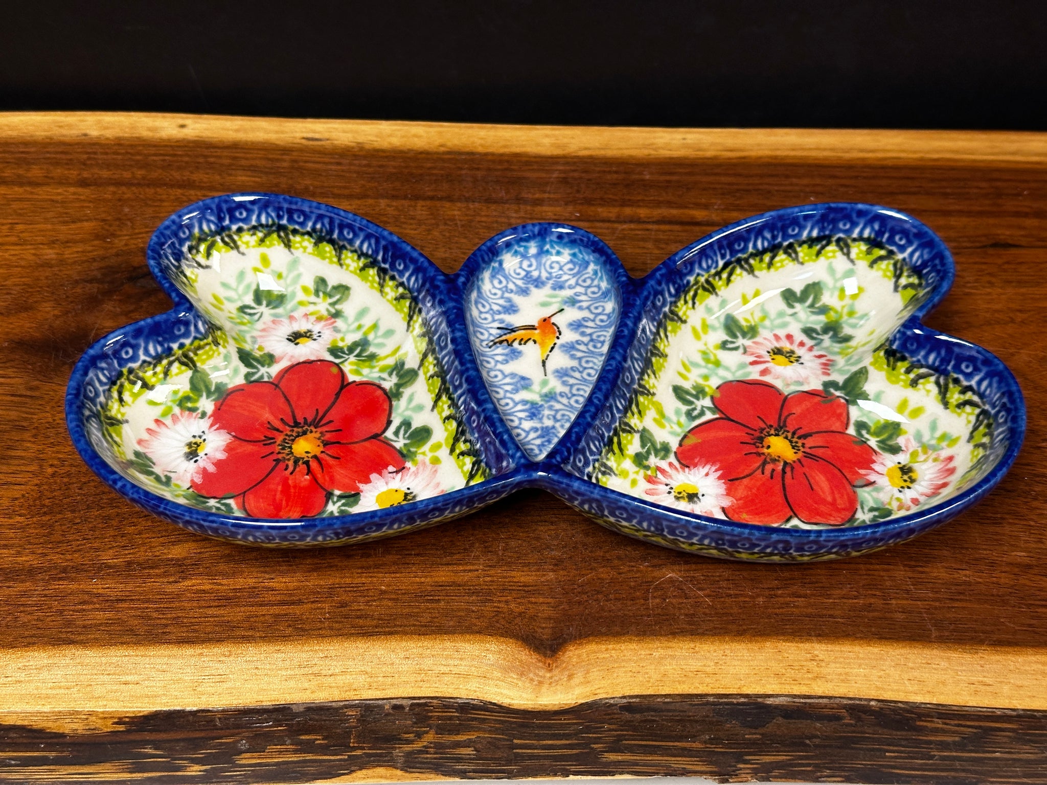 Uniquely shaped double serving divided dish. Butterfly shape adds a bit of whimsy to your serving pieces!