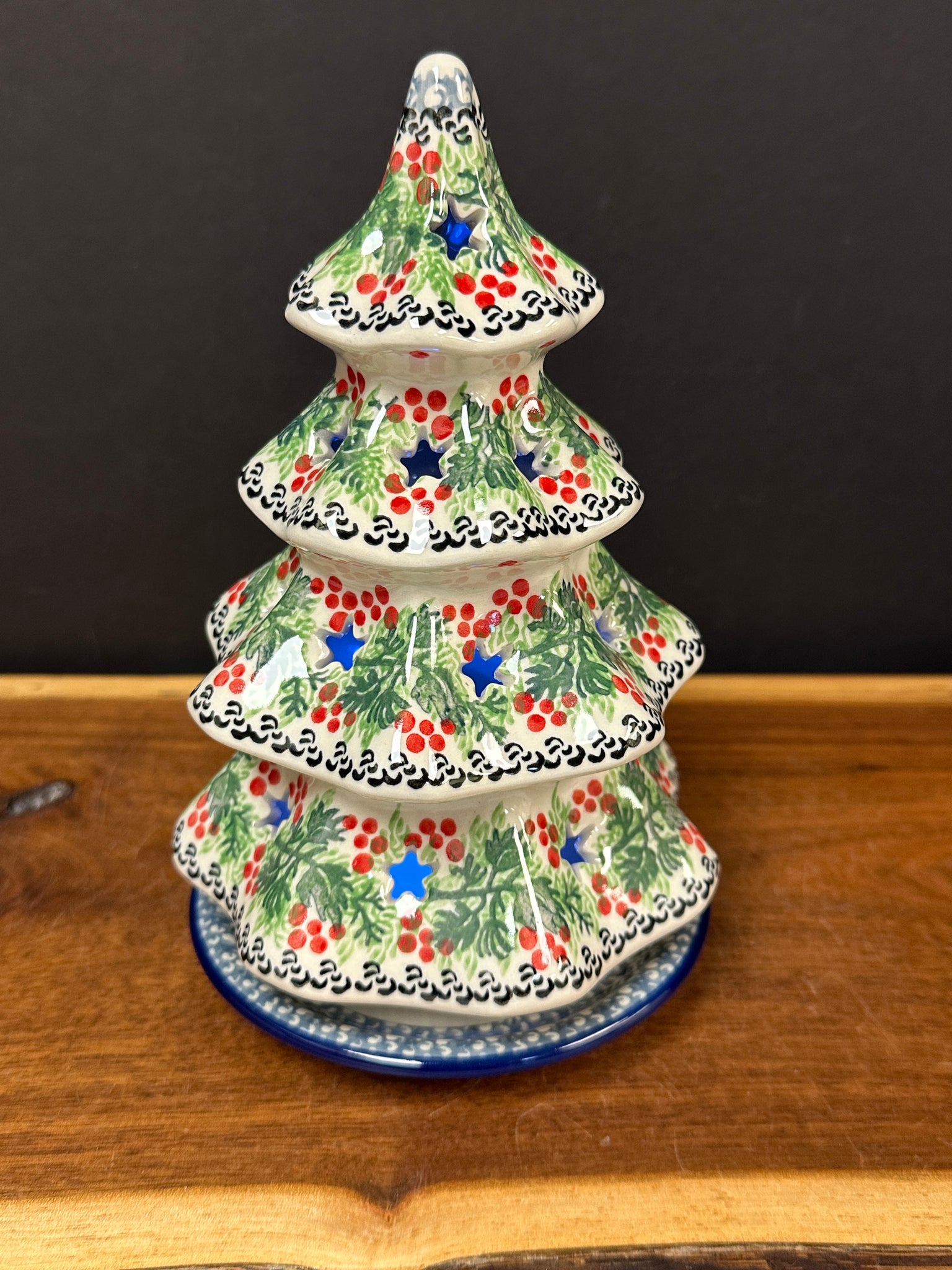 Trees have star-shaped holes for the glow of a tealight, string lights or a votive candle. Trees come with a matching base plate and one color changing battery operated candle.