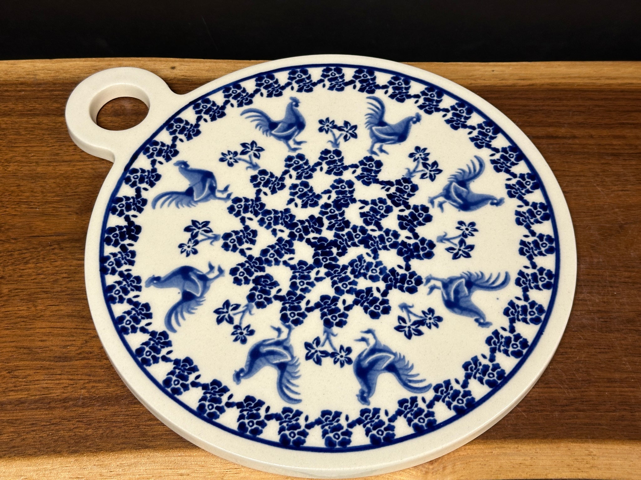 Cutting Board or Trivet measures 9" diameter plus has a 2" hanging loop.